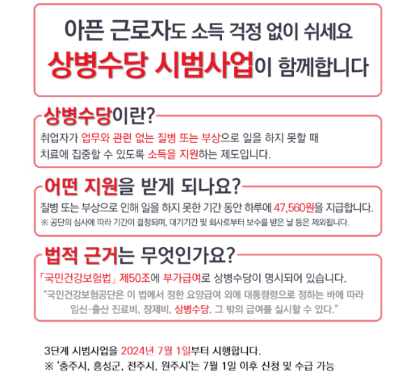 이러한 문제를 해결하고자 도입된 제도가 바로 ‘상병수당’입니다. 이는 근로자가 질병이나 부상으로 일을 하지 못할 경우 치료에 집중할 수 있도록 소득 일부를 보전해주는 사회보장제도로, 건강권과 노동권을 함께 지키기 위한 제도적 장치입니다.